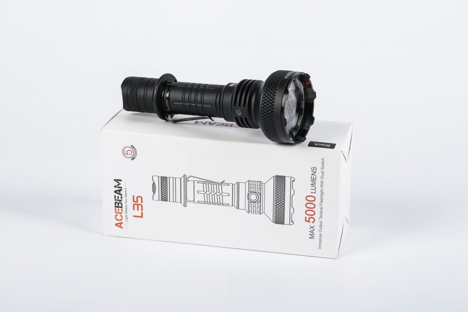 The ACEBEAM L35 Tactical Flashlight is a powerful, compact lighting tool built for tactical use, outdoor adventures, and professional applications. Delivering up to 5,000 lumens with an impressive beam distance of up to 570 metres, the L35 combines flood and throw performance with rugged durability, intuitive dual-switch control, and long runtime for reliable performance in any environment.