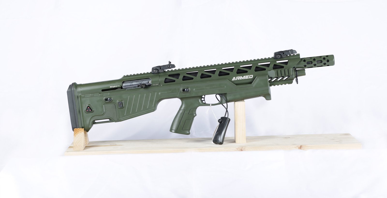 The ARMED Tactical Bullpup Shotgun is designed for compact handling, modern ergonomics, and effective control in a tactical shooting platform. Its bullpup layout places the action rearward, reducing overall length while maintaining a stable shooting stance. Built with a robust chassis and integrated rail system, it is well suited for range use and tactical-style applications.