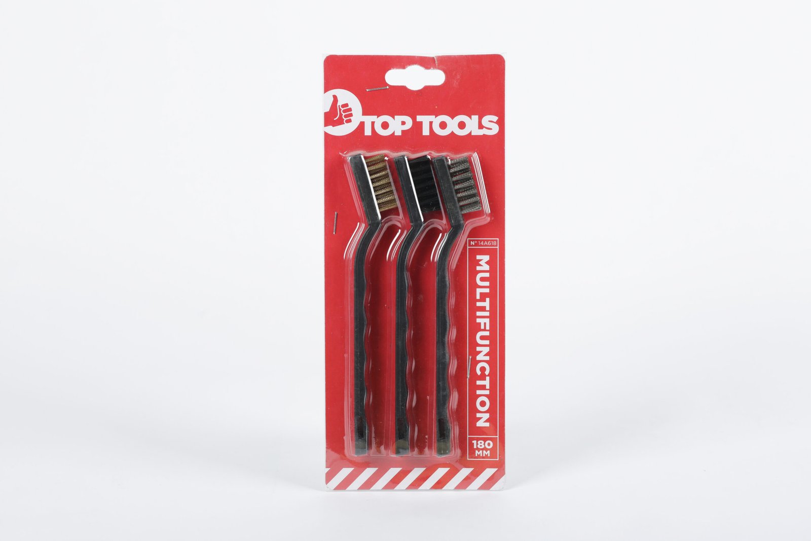 The TOP TOOLS 3-piece mini wire brush set provides durable and precise brushes for cleaning firearms, tools, machinery, and other equipment, making it ideal for detail work and hard-to-reach areas.